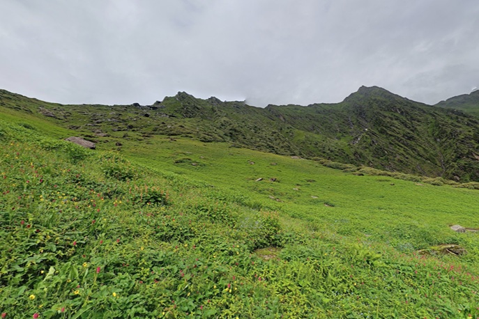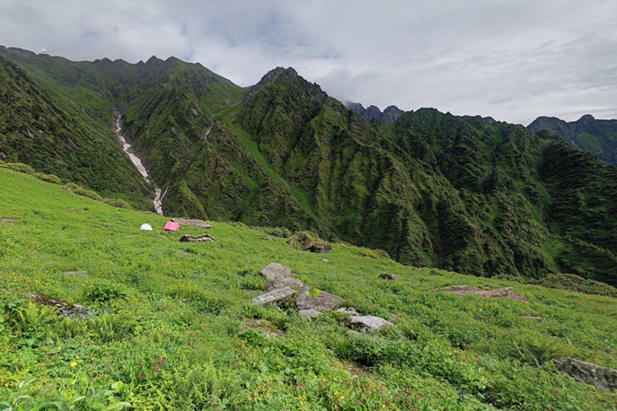 कठिनाई भरे मार्ग को पार करने के बाद आप अतंतः अपनी आज की कैंप साइट वाले स्थान पर पहुँच जाते है, जो की वाकई में काफी खूबसूरत है। यहाँ से आपको घाटी और दूर नंदा देवी पर्वत अपने अध्भुत नज़ारे पेश करती हुई दिखती है, जिनसे नजर हटाना बेहद मुश्किल है। इस स्थान से आपको चेनाप घाटी में मिलने वाली विभिन्न प्रजातियों के रंग बिरंगे फूल दिखाई देने लगते है।