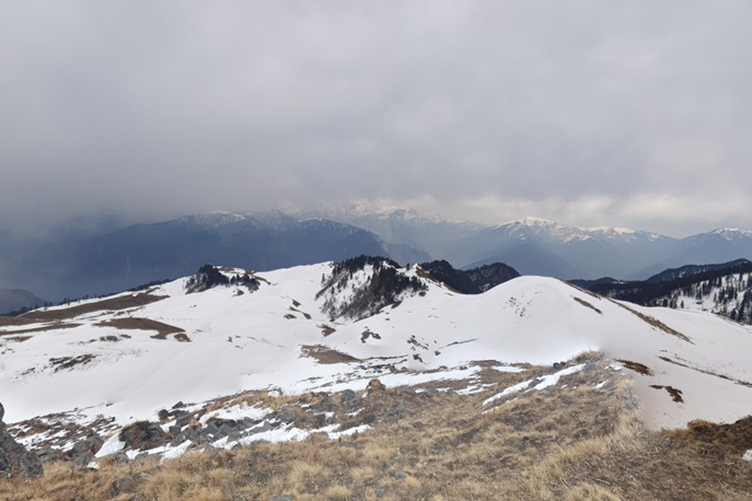 After our morning meal, we begin the trek. As soon as we start, the view of the surroundings becomes clear, and the snow-capped mountains which are hidden the previous day are now clearly visible. Along the trail, we pass through a small meadow and a traditional chhanis (a shelter home for the animals). Alongside, we also identify igloo-shaped huts built by the forest department.